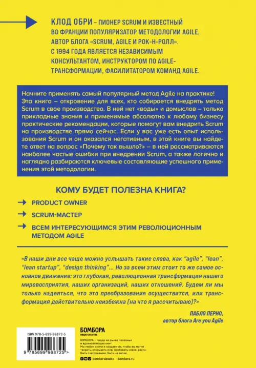 Одна из самых понятных и исчерпывающих книг-руководств по внедрению Scrum на производстве, проданная во всем мире тиражом свыше 20 000 экземпляров. В ней вы найдете целый пласт полезной и уникальной прикладной информации, с помощью которой без труда освоите эту востребованную методологию Agile и незамедлительно сможете применить ее на практике. Книга будет исключительно полезна читателям, выступающим в роли Product Owner или Scrum мастер, но и те, кто пока лишь интересуется Scrum, найдут в ней много нового. Клод Обри, известный французский энтузиаст Agile и пионер Scrum, рассматривает в своей книге такие вопросы, как: - Работа команды — люди, их роли и взаимодействие в экосистеме. - Бэклог — его структура и доработка. - Составляющие спринта — планирование, схватка, демо, ретро. - Прелюдия — краеугольный камень успешного старта работы. - Полезные дополнения к Scrum — планирование, индикаторы, инструменты, инженерия. - Пути внедрения Scrum в организации. Технология Scrum с каждым годом получает все большее распространение и постоянно меняется, подстраиваясь под вызовы и потребности сегодняшнего дня. Будьте гибкими, используйте Scrum и повышайте эффективность своей команды при помощи этого издания!