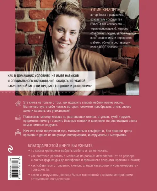 Редизайн мебели - это не только про "подарить старой мебели новую жизнь", это про "почувствовать себя частью истории и вершителем судеб", это про любовь внутри нас, про то, что вы хотите рассказать миру без лишних слов. В этой книге инстаграм-блогер @kempel.yulia на языке простого обывателя рассказывает о том, как можно в домашних условиях, не имея навыков и специального образования, создать из убитой бабушкиной мебели предмет гордости и достояния. Автор поможет сделать ваш творческий путь максимально комфортным, без лишней траты времени и денег на ненужную информацию, инструменты и материалы. Более 200 тысяч подписчиков активно используют рекомендации Юлии Кемпель и создают настоящие интерьерные шедевры! Вы узнаете, по каким критериям выбрать мебель и где ее искать, научитесь поэтапно работать с мебелью из разных материалов: от ее разбора и снятия фурнитуры до шлифовки и финишного покрытия краской и лаком. Пошаговые мастер-классы по редизайну столов, стульев, тумб и других предметов помогут освоить базовые навыки и вдохновят на реализацию своих самых смелых задумок!