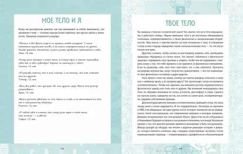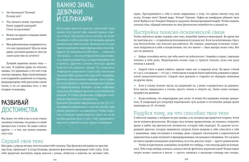 Идеология книги построена на внутренних границах и самоуважении. Общаясь со своей читательницей на равных, авторы книжки заводят разговор об очень сложных и важных темах, с которыми, взрослея, сталкивается каждая девочка. Например: