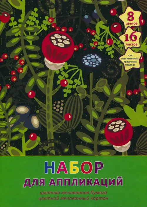Набор для аппликаций. В наборе цветной мелованный односторонний картон и цветная мелованная односторонняя бумага. 16 листов по 8 листов каждого вида. 8 цветов. Формат: А4. Сделано в России.