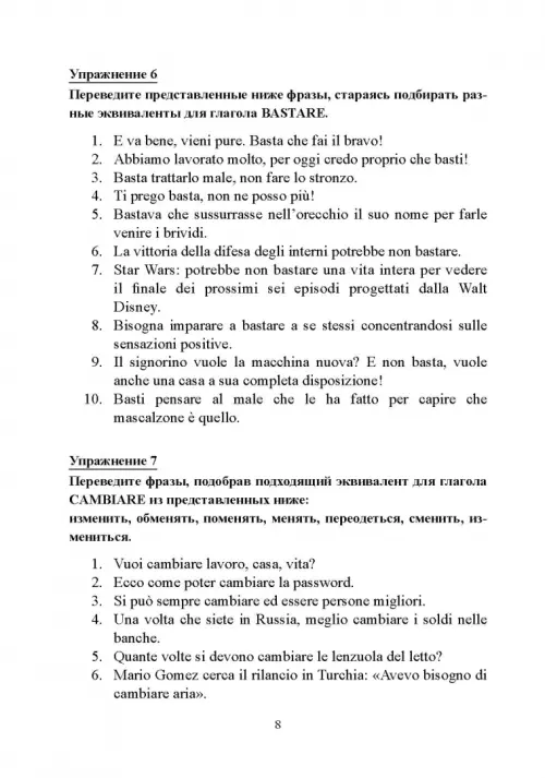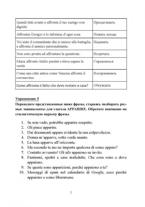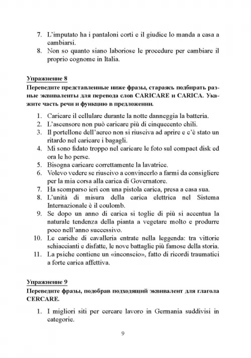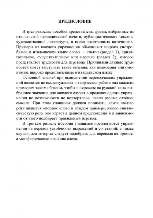 Настоящее пособие представляет собой сборник упражнений, направленных на разработку навыков письменного перевода с итальянского языка на русский на материале аутентичных итальянских источников, подобранных таким образом, чтобы как можно шире раскрыть многозначность итальянской лексики, представить наиболее употребительные слова в различных контекстах, помочь учащимся распознавать случаи омонимии в итальянском языке, а также значительно повысить словарный запас. Пособие адресовано русскоязычным студентам, изучающим итальянский язык, хорошо владеющим русским и итальянским языками, а также всем, кто изучает итальянский язык в школах, на курсах и самостоятельно. Приблизительный уровень итальянского языка, требующийся для успешного выполнения заданий - не ниже B1.