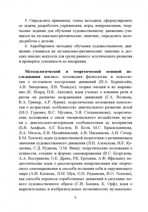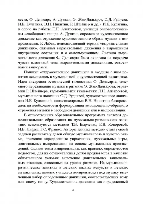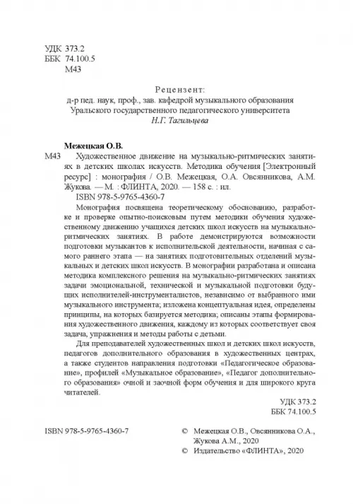Монография посвящена теоретическому обоснованию, разработке и проверке опытно-поисковым путем методики обучения художественному движению учащихся детских школ искусств на музыкально-ритмических занятиях. В работе демонстрируются возможности подготовки музыкантов к исполнительской деятельности, начиная с самого раннего этапа - на занятиях подготовительных отделений музыкальных и детских школ искусств. В монографии разработана и описана методика комплексного решения на музыкально-ритмических занятиях задачи эмоциональной, технической и музыкальной подготовки будущих исполнителей-инструменталистов, независимо от выбранного ими музыкального инструмента; изложена концептуальная идея, определены принципы, на которых базируется методика; описаны этапы формирования художественного движения, каждому из которых соответствует своя задача, упражнения и методы работы с детьми. Для преподавателей художественных школ и детских школ искусств, педагогов дополнительного образования в художественных центрах, а также студентов направления подготовки "Педагогическое образование", профилей "Музыкальное образование", "Педагог дополнительного образования" очной и заочной форм обучения и для широкого круга читателей.