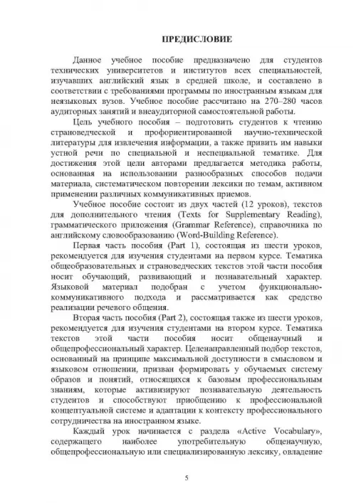 Учебное пособие написано в соответствии с программой по иностранным языкам для неязыковых вузов. Пособие содержит аутентичные тексты общепрофессиональной и научно-специальной направленности, разнообразные тренировочные упражнения, дополнительные тексты для чтения, грамматический справочник. Предназначен для студентов технических вузов. 5-е издание.