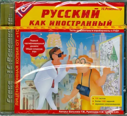 В состав данного продукта реально входят два: "1С:Репетитор 2.1" и "1С:Репетитор. Русский как иностранный". "1С:Репетитор 2.1" - это программная оболочка фирмы "1С" для тех, кто учится, и тех, кто учит. Ее основное назначение - создание комфортной обучающей среды, позволяющей работать с мультимедиа-учебниками, справочными материалами, диагностическими, обучающими и контролирующими тестовыми системами по разным предметам, которые уже разработаны и будут разрабатываться нашей фирмой в дальнейшем. Обучающе-контролирующие тесты "1С:Репетитор. Русский как иностранный" адресованы студентам-иностранцам, изучающим русский язык, а также преподавателям русского как иностранного. Обучающе-контролирующие тесты "1С:Репетитор. Русский как иностранный" - это система компьютерных тестов по разделам: "Лексика", "Грамматика", "Чтение", "Письмо", "Аудирование", "Говорение", позволяющая студентам-иностранцам подготовиться к тестированию по русскому как иностранному (Первый сертификационный уровень. Общее владение РКИ). Тесты содержат несколько типов заданий: выбор позиций; ввод текста; аудирование; устный ответ. Все задания по форме и содержанию максимально приближены к экзаменационным. После выполнения теста проводится анализ работы: предусмотрена возможность ее просмотра с комментариями и правильными ответами, прослушивания ответов в режиме диалога. Можно также подать на апелляцию. Результаты тестирования по всем темам сохраняются в "Дневнике", предусмотрена возможность выполнения тестов в заданном порядке ("Задание на сегодня"). Системные требования: Операционная система Microsoft Windows 98\Me\Vista\XP; Процессор Pentium III; HDD 52 мб; RAM 128 мб; звуковая карта; микрофон; InternetExplorer 5.5; мышь.