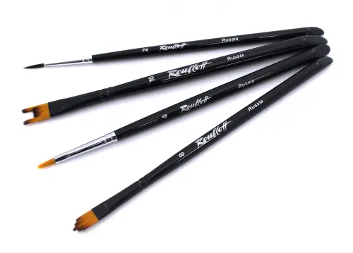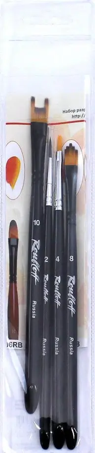 Набор для творчества №5 в пластиковом прозрачном блистере из 4-х синтетических кистей на короткой черной глянцевой ручке: круглая кисть № 02 (серия 2F1), плоская кисть № 04 (серия 14), кисть "Ступенчатая" фигурная № 08 (серия 20), кисть плоская фигурная "Двузубец" № 10 (серия 22). Сделано в России.