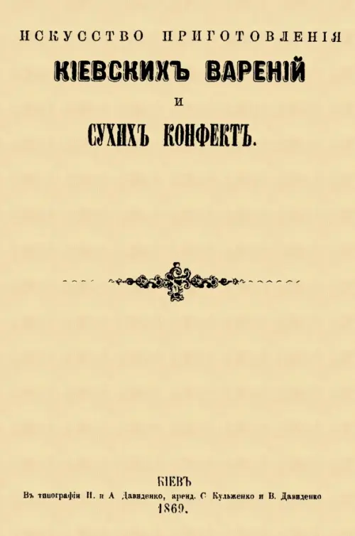 Репринт с издания. Киев 1869. 55 рецептов варений и конфет. В прибавлении - рецепты блинов и оладьев. Тираж 30 экз. выполнен по технологии print-on-demand.