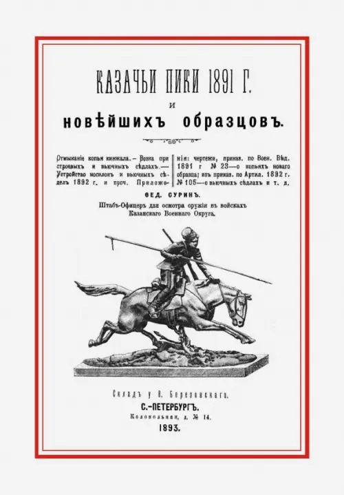 Репринт с издания. 4 листа чертежей. Федор Сурин - штаб-офицер для осмотра оружия в войсках Казан. воен. окр. Санкт-Петербург, тип. Окр. штаба в Казани, 1893. Содержание: Отмыкание копья кинжала. Возка при строевых и вьючных седлах. Устройство носилок и вьючных седел 1892 г. и проч. Приложения: чертежи, приказ. по Воен. Вед. 1891 г № 23-о копьях нового образца; из приказ. по Артил. 1892 г, №105-о вьючных седлах и т. д. Книга изготовлена по технологии "печать по требованию". Тираж 30 экз.