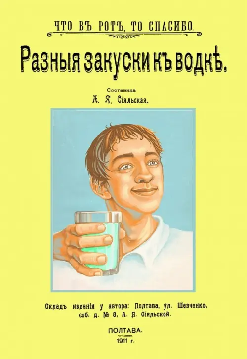 Репринт с издания. Полтава, 1911. Раздел "Разные закуски к водке" из кулинарного сборника "Что в рот, то спасибо". 97 рецептов. Тираж 30 экз. выполнен по технологии print-on-demand. Составила: А. Я. Сияльская.