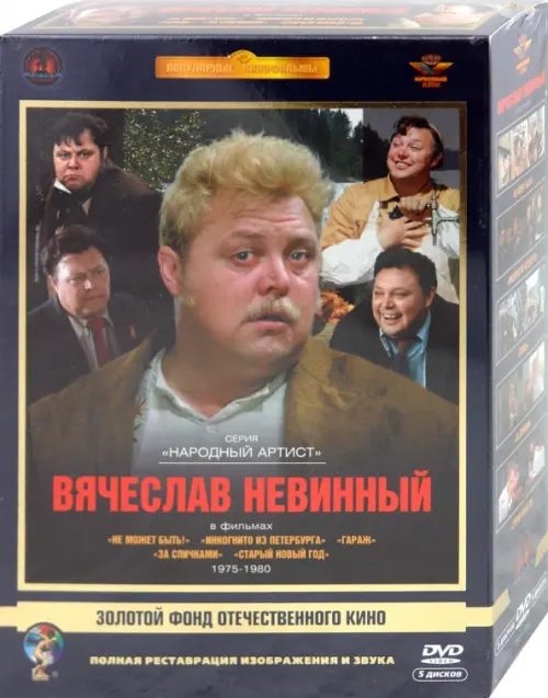 Невинный Вячеслав. 5 дисков Состав: "Не может быть!" Режиссер-постановщик: Л. Гайдай "Инкогнито из Петербурга" Режиссер-постановщик: Л. Гайдай "Гараж" Режиссер-постановщик: Э. Рязанов "За спичками" Режиссер-постановщик: Л. Гайдай "Старый Новый год" Режиссеры-постановщики: О. Ефремов, Н. Ардашников Полная реставрация изображения и звука.