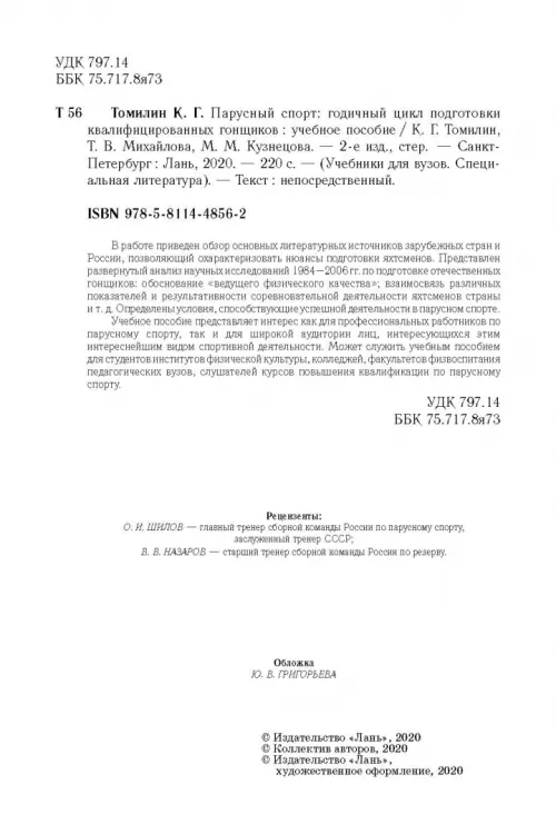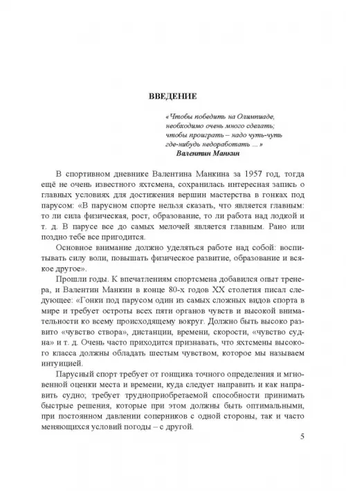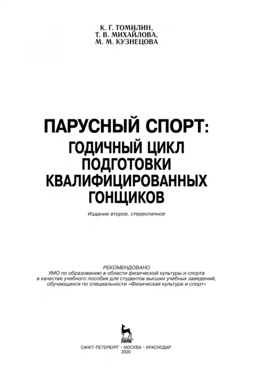 Учебное пособие является итогом многолетних исследований автора по парусному спорту. В работе приведен обзор основных литературных источников зарубежных стран и России, позволяющий охарактеризовать нюансы подготовки яхтсменов. Представлен развернутый анализ научных исследований 1984-2006 гг. по подготовке отечественных гонщиков: обоснование "ведущего физического качества"; взаимосвязь различных показателей и результативности соревновательной деятельности яхтсменов страны и т. д. Определены условия, способствующие успешной деятельности в парусном спорте. Учебное пособие представляет интерес как для профессиональных работников по парусному спорту, так и для широкой аудитории лиц, интересующихся этим интереснейшим видом спортивной деятельности. Может служить учебным пособием для студентов институтов физической культуры, колледжей, факультетов физвоспитания педагогических вузов, слушателей курсов повышения квалификации по парусному спорту. Рекомендовано УМО по образованию в области физической культуры и спорта в качестве учебного пособия для студентов высших учебных заведений, обучающихся по специальности "Физическая культура и спорт". 2-е издание, стереотипное.