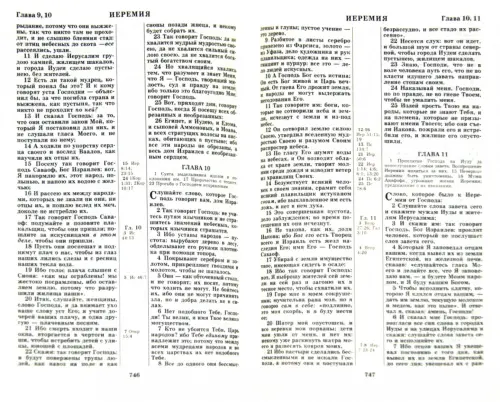 Священное Писание в Синодальном переводе. Сохранено постраничное расположение текста издания 1947 г. (набор в 2 колонки, указатель параллельных мест посередине страницы). Словарь. Цветные географические карты форзацах.