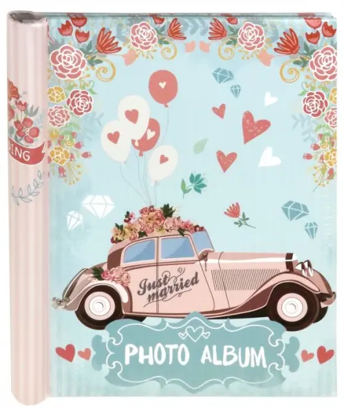 Фотоальбом "Свадебный кортеж" с обложкой из картона, с листами из картона с клеевым покрытием и пленкой-ПВХ для крепления фото, с креплением на гребне (10 листов). Размер 24х29 см. Сделано в Китае.