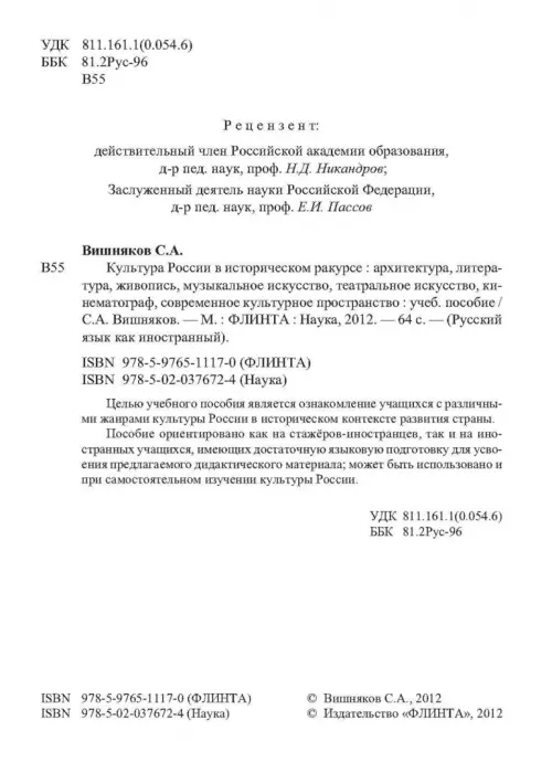 Целью учебного пособия является ознакомление учащихся с различными жанрами культуры России в историческом контексте развития страны. Пособие ориентировано как на стажёров-иностранцев, так и на иностранных учащихся, имеющих достаточную языковую подготовку для усвоения предлагаемого дидактического материала; может быть использовано и при самостоятельном изучении культуры России.