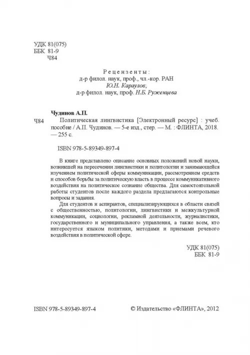 В книге представлено описание основных положений новой науки, возникшей на пересечении лингвистики и политологии и занимающейся изучением политической сферы коммуникации, рассмотрением средств и способов борьбы за политическую власть в процессе коммуникативного воздействия на политическое сознание общества. Для самостоятельной работы студентов после каждого раздела предлагаются контрольные вопросы и задания. Для студентов и аспирантов, специализирующихся в области связей с общественностью, политологии, лингвистики и межкультурной коммуникации, социологии, рекламной деятельности, журналистики, государственного и муниципального управления, а также всем, кто интересуется языком политики, методами и приемами речевого воздействия в политической сфере. 6-е издание, стереотипное.