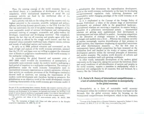 The authors have proved that M. Porter's theory of Competitive Advantage of Nations serves as a theoretical basis for the formation of the world economy monopolarity, while the identification of national competitiveness with the competitiveness of economic entities, first of all, TNCs and MNCs will prevent independent and sustainable economic development of Russia, India and China. The authors provide criteria to determin national competitiveness in the new environment and in this respect analyze a number of national economies. The book is recommended for politicians and economists, engineers and technicians of Russia and foreign countries, also while national specialists training.