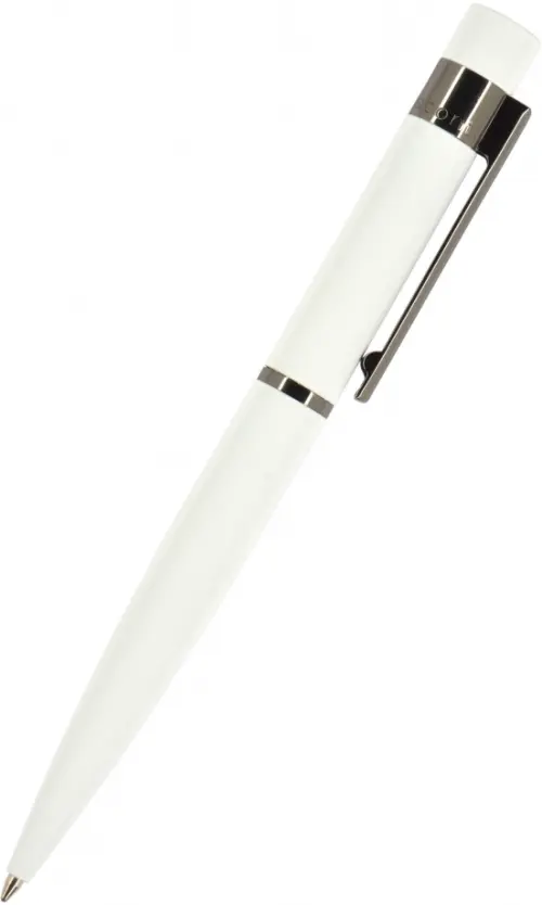 Белая классическая ручка в графичном дизайне из коллекции Verona. Это автоматическая шариковая ручка с качественными пигментными чернилами синего цвета. Металлический корпус ручки нескользящий, мягкий и теплый на ощупь благодаря резиновому напылению Soft Touch. Контраст добавляют кольцо и клип из глянцевого темного металла.