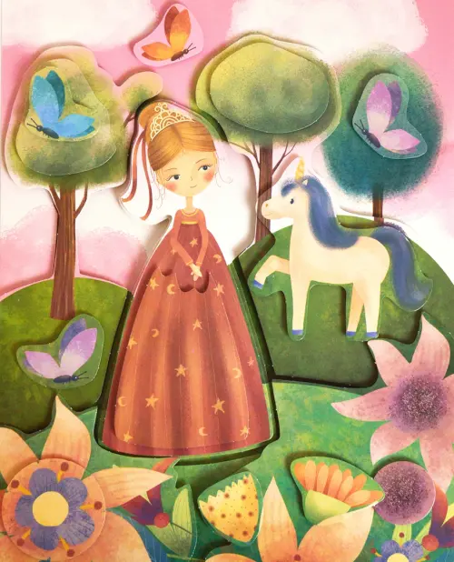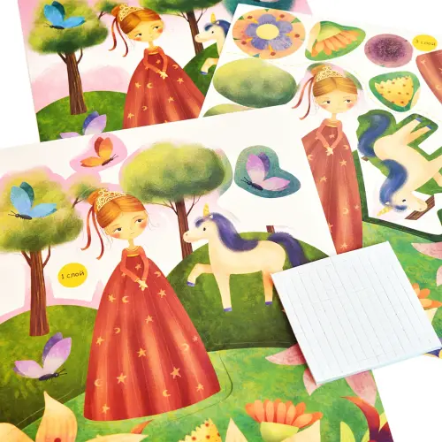 3D-аппликация - современный и очень увлекательный вид творчества. Ребёнок легко сделает объёмную 3D-картинку самостоятельно, ведь клей и ножницы ему не понадобятся. Детали аппликации уже вырублены, нужно только аккуратно выдавить их из основы, и приклеить на картинку объёмным двусторонним скотчем. Изображения принцессы, единорога, цветов и бабочек наклеиваются в несколько слоёв, что придаёт плоскому изображению эффект объёма. Аппликация выполнена в мягкой, приглушённой цветовой гамме, напоминает средневековый гобелен.