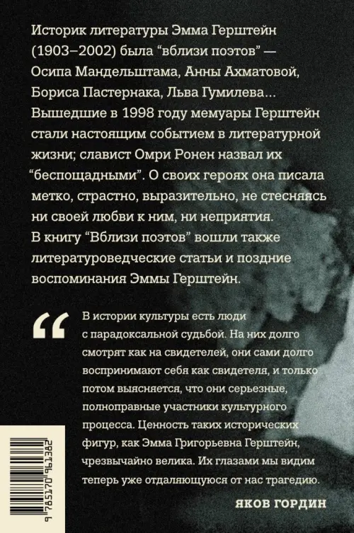 Эмма Григорьевна Герштейн (1903-2002) - историк литературы, мемуарист. Эмме Герштейн посчастливилось находиться рядом с теми, чьи имена вписаны в историю русской культуры. Вблизи, а не издали она наблюдала за выдающимися писателями и учеными ХХ века - Осипом Мандельштамом, Анной Ахматовой, Борисом Пастернаком, Львом Гумилевым, Николаем Харджиевым. Вышедшие в 1998 году мемуары Герштейн стали настоящим событием в литературной жизни, славист Омри Ронен назвал их "беспощадными". О своих героях Герштейн писала метко, страстно, выразительно, не стесняясь ни своей любви к ним, ни неприятия. В книгу "Вблизи поэтов" также вошли литературоведческие статьи и поздние воспоминания Э.Г. Герштейн, публиковавшиеся в журнале "Знамя" в 1999 и 2002 годах.