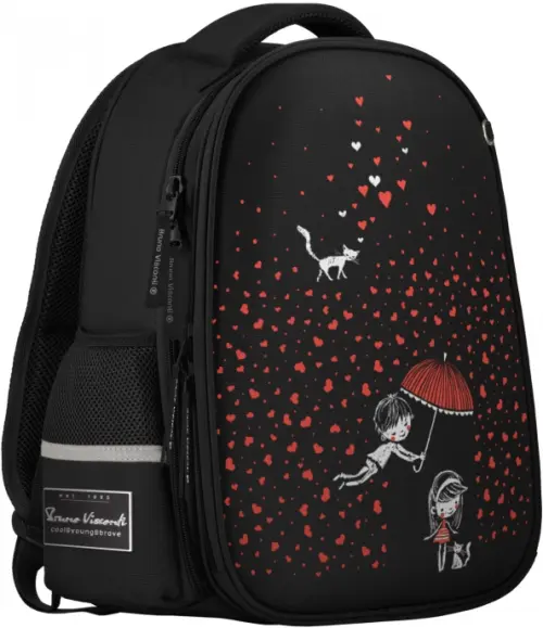 Рюкзак с авторским дизайном, с использованием сложнейших современных технологий нанесения на ткань. Ткань водонепроницаемая, морозостойкая, с повышенной износостойкостью, грязеотталкивающая. Двунаправленные-реверсивные надежные 8-мм молнии с 5-см пуллером на замках, что позволяет легко открывать и закрывать рюкзак. Эргономичная спинка, комфортная при длительном использовании, вентилируемая, с анатомическими подушечками. Регулируемые лямки анатомической формы и ручка с усиленным креплением готовы к любым нагрузкам. Износостойкая фирменная подкладка Bruno Visconti, тщательно подобранная и сочетающаяся с дизайном и цветом рюкзака. Рюкзак имеет два основных отделения: первое отделение содержит органайзер с молнией и карман-сеточку, второе отделение состоит из трех частей с двумя разделителями с фиксирующим ремнем и дополнено карманом на молнии для карточки. Рюкзак снабжён четырьмя светоотражающими элементами. Усиленное дно рюкзака оснащено резиновыми ножками, защищающими от загрязнения и влаги.