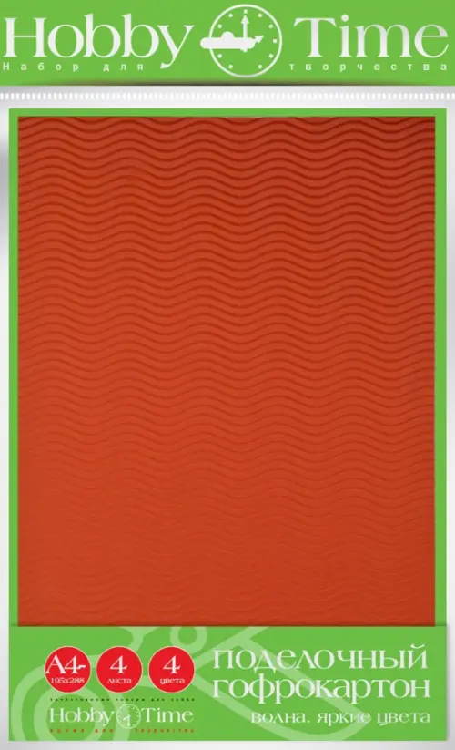 Гофрокартон поделочный. Яркие цвета. Волна, 4 листа, 4 цвета