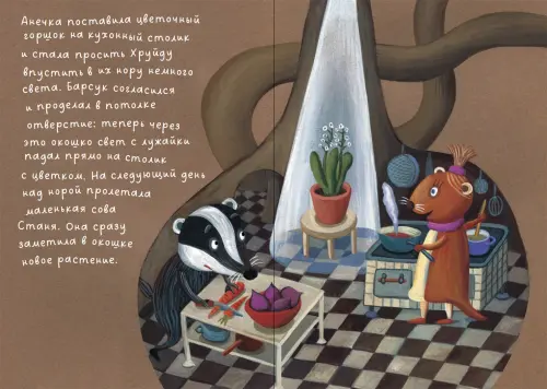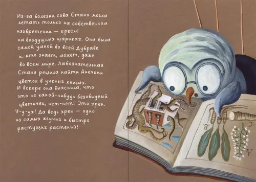 Главный злодей Дубравы - хорек Смрадольф - задумал похитить ласку Анечку. Главная роль в его коварном плане отведена корню хрена. Но что-то пошло не так, и всем зверям пришлось покинуть свои норки. Хорошо, что есть сова Станя и ее чудесные изобретения! Отважный Хруйда вступит в бой с непрошеным гостем. Добро победит, а наглый корень превратится в приправу. И Хруйда твердо усвоит: зло нужно искоренять вовремя. Писатель Петр Станчик - чешский поэт, прозаик, автор детских книг, драматург и эссеист. До 2006 года писал под псевдонимом. Лауреат премии Magnesia Litera (2015) за прозу. "Станчик просто наслаждается собой. Его книги вы захотите брать с собой везде, восторженно цитируя при любой возможности" - говорят об авторе критики. Иллюстратор Луция Дворжакова окончила Академию художеств, архитектуры и дизайна в Праге, студию кино- и телевизионной графики. Занимается иллюстрацией книг и журналов, анимационных фильмов и художественным оформлением детских телепрограмм. Лауреат множества премий: Золотая лента (1995, 1996), Koh-I-Nor Hardmuth (2004), Namibook Island (2013).