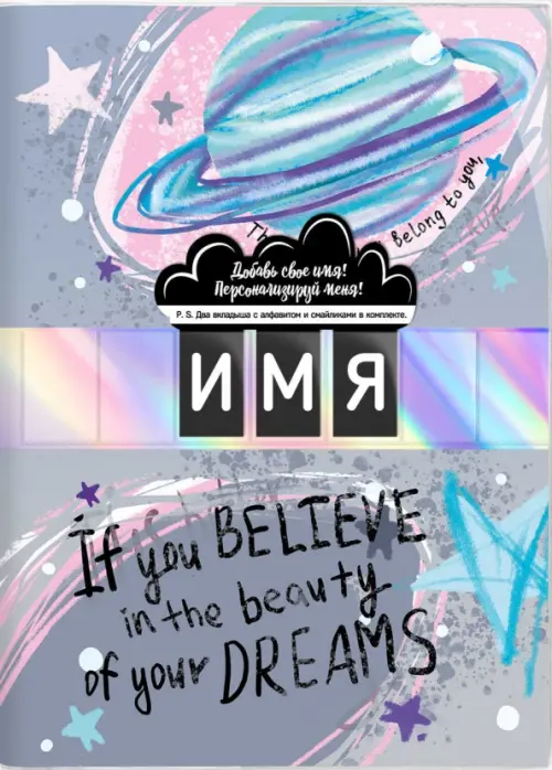 Формат: А5. Количество листов: 96 Тип обложки: мягкий переплёт Способ скрепления блока: вставной блок, ниткошвейный Материал обложки: голографическая бумага, ПВХ Обстрочка по периметру: нет Тип корешка: скруглённый Углы обложки: прямые Цвет бумаги: белый офсет Плотность бумаги:70 г/м2 Красочность блока: печать в одну краску Дизайн блока: линия, точка Углы блока: прямые Красочность форзаца: печать пантоном Ляссе: одно ляссе Каптал: нет Особенности: два вкладыша с алфавитом и смайликами в комплекте, ПВХ-кармашки для персонализации на лицевой части обложки, съёмная обложка