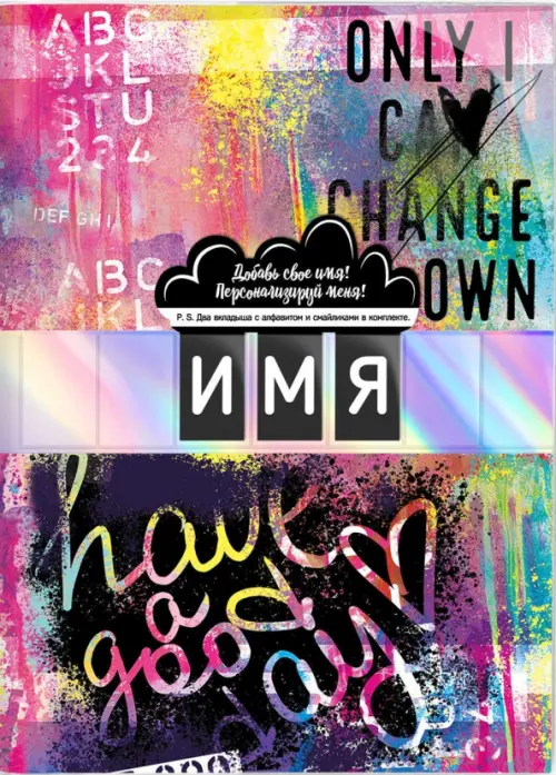 Формат: А5. Количество листов: 96. Тип обложки: мягкий переплёт. Способ скрепления блока: вставной блок, ниткошвейный. Материал обложки: голографическая бумага, ПВХ. Обстрочка по периметру: нет. Тип корешка: скруглённый. Углы обложки: прямые. Цвет бумаги: белый офсет. Плотность бумаги:70 г/м2. Красочность блока: печать в одну краску. Дизайн блока: линия, точка. Углы блока: прямые Красочность форзаца: печать пантоном Ляссе: одно ляссе Каптал: нет Особенности: два вкладыша с алфавитом и смайликами в комплекте, ПВХ-кармашки для персонализации на лицевой части обложки, съёмная обложка