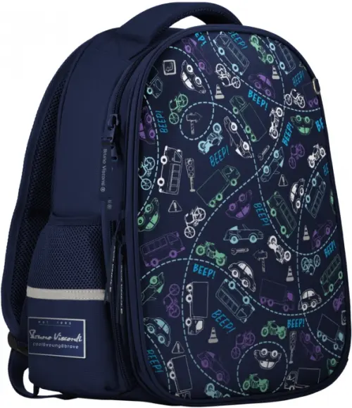Рюкзак с авторским дизайном, с использованием сложнейших современных технологий нанесения на ткань. Ткань водонепроницаемая, морозостойкая, с повышенной износостойкостью, грязеотталкивающая. Двунаправленные-реверсивные надежные 8-мм молнии с 5-см пуллером на замках, что позволяет легко открывать и закрывать рюкзак. Эргономичная спинка, комфортная при длительном использовании, вентилируемая, с анатомическими подушечками. Регулируемые лямки анатомической формы и ручка с усиленным креплением готовы к любым нагрузкам. Износостойкая фирменная подкладка Bruno Visconti, тщательно подобранная и сочетающаяся с дизайном и цветом рюкзака. Рюкзак имеет два основных отделения: первое отделение содержит органайзер с молнией и карман-сеточку, второе отделение состоит из трех частей с двумя разделителями с фиксирующим ремнем и дополнено карманом на молнии для карточки. Рюкзак снабжён четырьмя светоотражающими элементами. Усиленное дно рюкзака оснащено резиновыми ножками, защищающими от загрязнения и влаги.