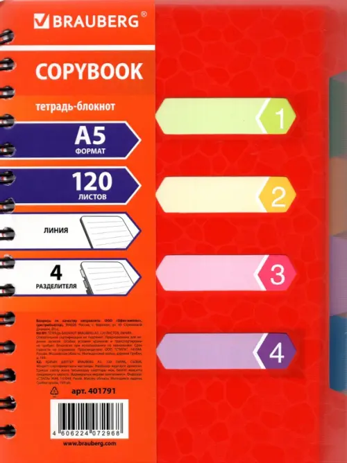 Тетрадь снабжена четырьмя пластиковыми, съемными разделителями.