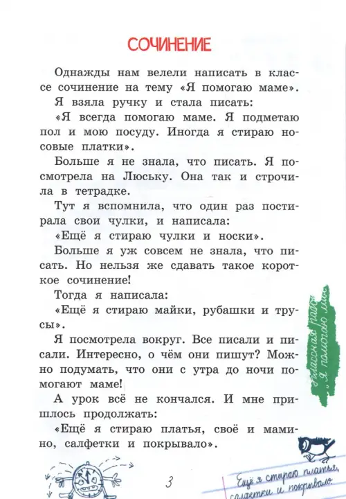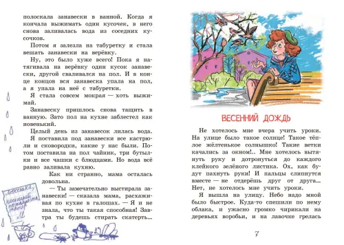 Прекрасно подходит для самостоятельного чтения благодаря крупному шрифту, большому количеству иллюстраций и весёлым текстам. В книгу входят два рассказа: "Весенний дождь" и "Сочинение".