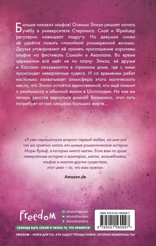 Больше никаких эльфов! Осенью Элиза решает начать учебу в университете Стерлинга. Скай и Фрейзер регулярно навещают подругу. Но девушке снова не удается пожить спокойной размеренной жизнью. Друзья уговаривают ее принять приглашение королевы эльфов на фестиваль Самайн в Аваллахе. Во время церемонии все идет не по плану: Элиза, ее друзья и Кассиан оказываются в странном доме, где с ними происходят невероятные чудеса. И со временем ребят настолько захватывает атмосфера этого магического места, что Элиза остается единственной, кто еще помнит о реальности и обычной жизни в Шотландии. Но как им теперь удастся вернуться домой? Возможно, этот путь потребует от них слишком больших жертв…