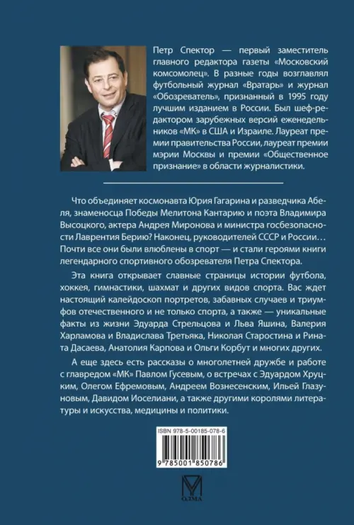 Эта книга открывает славные страницы истории футбола, хоккея, гимнастики, шахмат и других видов спорта. Вас ждет настоящий калейдоскоп портретов, забавных случаев и триумфов отечественного и не только спорта, а также - уникальные факты из жизни Эдуарда Стрельцова и Валерия Харламова, Льва Яшина и Владислава Третьяка, Анатолия Карпова и Ольги Корбут, Рината Дасаева и Николая Старостина и многих других.