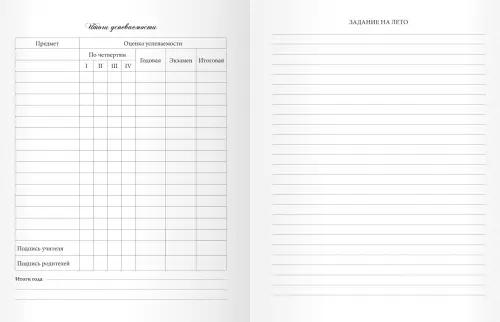 Внутренний блок: 48 листов из белой офсетной бумаги (60 г/м), печать в одну краску, комфортная сетка для записей домашнего задания, расписания концертной деятельности, заданий на лето, итогов успеваемости и рекомендации преподавателями.
