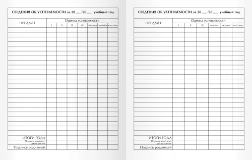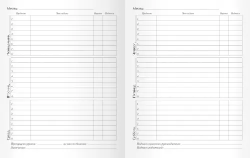 Внутренний блок (60 р/м2) дневника со стандартной линовкой (6 дней х 8 строк), в одну краску, предназначен для записи расписания уроков, домашнего задания, фиксирования оценок, замечаний.