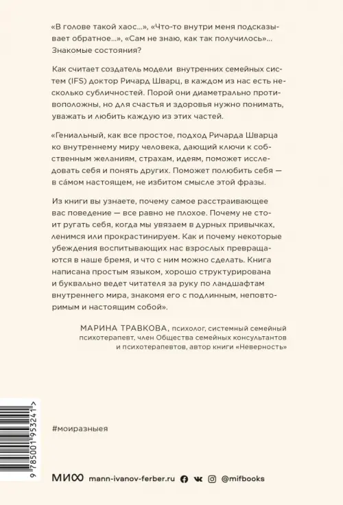"У нас от рождения есть субличности, или части. Эти части не воображаемые и не символические. Все это личности, которые существуют как внутренняя семья внутри нас ? и ключ к здоровью и счастью состоит в том, чтобы уважать, понимать и любить каждую из своих частей", - говорит доктор Шварц. Это суть модели внутренних семейных систем (IFS), которая трансформировала психологию на протяжении десятилетий.