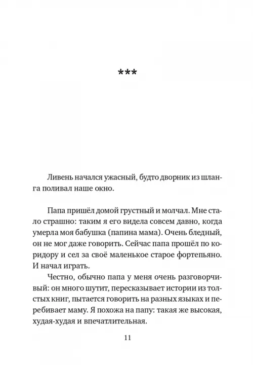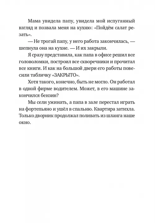«Мама была категорически против идеи папы работать художником. Рисовать людей у него совсем не получалось. Один из маминых портретов даже пришлось выкинуть, так она расстроилась, увидев рисунок. Я голосовала за работу переводчиком с собачьего. Если бы папу взяли на эту должность, у нас дома наконец могла бы появиться собака! Я бы гуляла с ней по утрам, а папа бы – по вечерам. Ещё мы вместе ездили бы в парк, наряжали собаку на Новый год оленем и научили бы её катать санки… Но никто не слушал меня! А папа уже набирал номер, указанный в объявлении о поиске внутренней жабы»