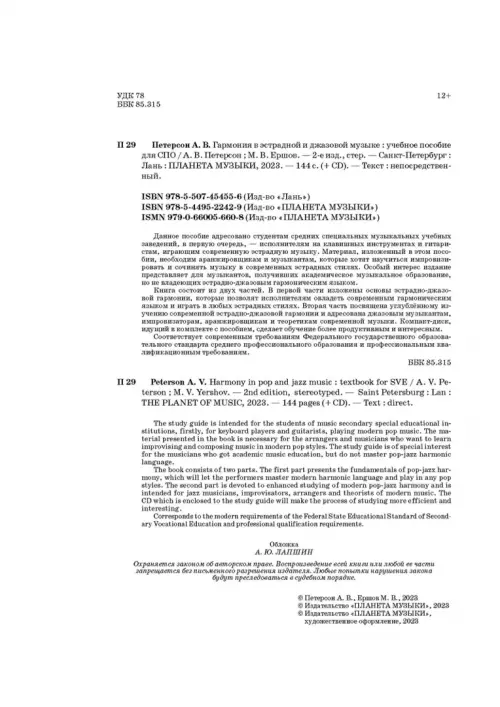 Если вы обнаружили ошибку в описании товара «Гармония в эстрадной и джазовой музыке (+CD) СПО» (авторы: Петерсон Александр Вальтерович, Ершов Максим Викторович), то выделите её мышкой и нажмите Ctrl+Enter. Спасибо, что помогаете нам стать лучше!