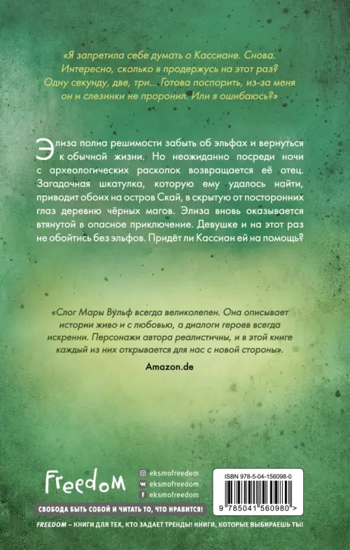 Элиза полна решимости забыть об эльфах и вернуться к обычной жизни. Но неожиданно посреди ночи с археологических раскопок возвращается ее отец. Загадочная шкатулка, которую ему удалось найти, приводит обоих на остров Скай, в скрытую от посторонних глаз деревню черных магов. Элиза вновь оказывается втянутой в опасное приключение. Девушке и на этот раз не обойтись без эльфов. Придет ли Кассиан ей на помощь?
