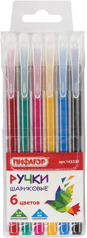 В наборе 6 одноразовых шариковых ручек с различными цветами чернил: голубой, зеленый, чёрный, розовый, красный и желтый. Удобный шестигранный корпус и яркий дизайн. Цвет корпуса соответствует цвету чернил. Диаметр пишущего узла 0,7 мм создает тонкую линию письма, равную 0,35 мм.