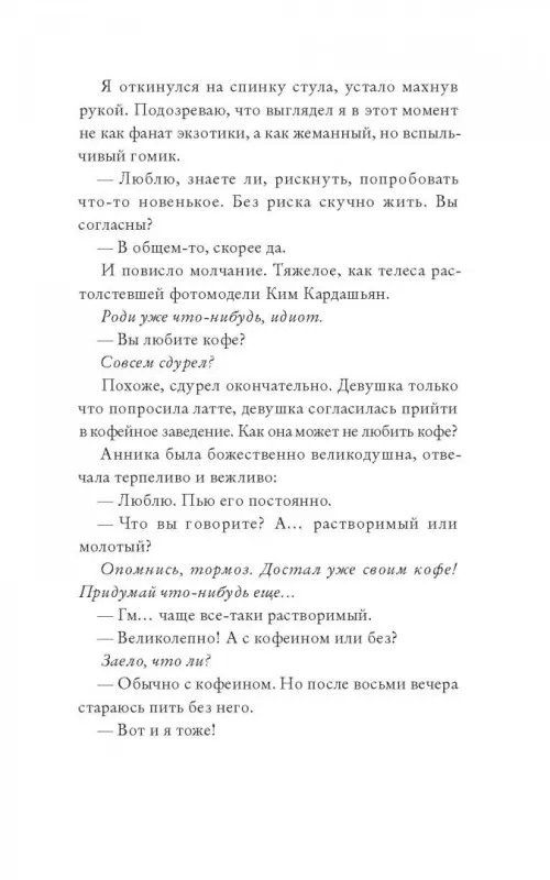 Это очень смешная и удивительно честная книга о жизни и о любви. О том, как невероятно трудно встретить свою половинку. И подчас еще труднее удержать рядом с собой, умудрившись не испортить по глупости или неосторожности едва завязавшиеся отношения.