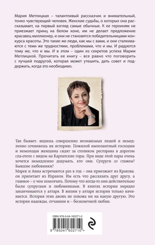 Они встречаются раз в год — она приезжает из Кракова, он прилетает из Израиля. Им есть что рассказать друг другу, а главное — о чем помолчать. Потому что когда-то они были супругами и, казалось, ничто не сможет разлучить их. Но так получилось, что горе выжгло любовь. Но, как оказалось, на этом не закончился их роман. Просто они перевернули страницу и открыли новую главу.