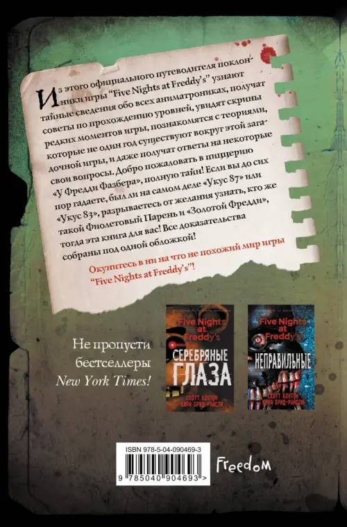 Добро пожаловать в пиццерию «У Фредди Фазбера», полную тайн! Если вы до сих пор гадаете, был ли на самом деле «Укус 87» или «Укус 83», разрываетесь от желания узнать, кто же такой Фиолетовый Парень и «Золотой Фредди», тогда эта книга для вас! Все доказательства собраны под одной обложкой! Окунитесь в ни на что не похожий мир игры «Пять ночей с Фредди». Супербестселлер во всём мире!