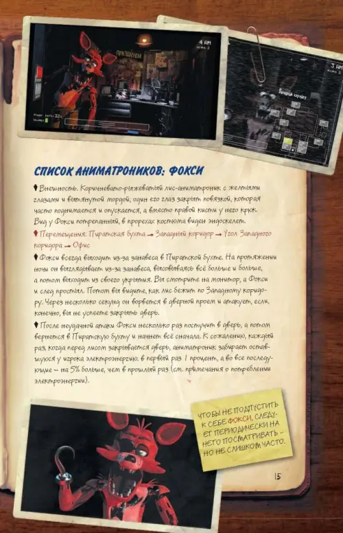 Из этого официального путеводителя поклонники игры Five Nights at Freddy`s (ФНАФ) узнают тайные сведения обо всех аниматрониках, получат советы по прохождению уровней, увидят скрины редких моментов игры, познакомятся с теориями, которые не один год существуют вокруг этой загадочной игры, и даже получат ответы на некоторые свои вопросы.