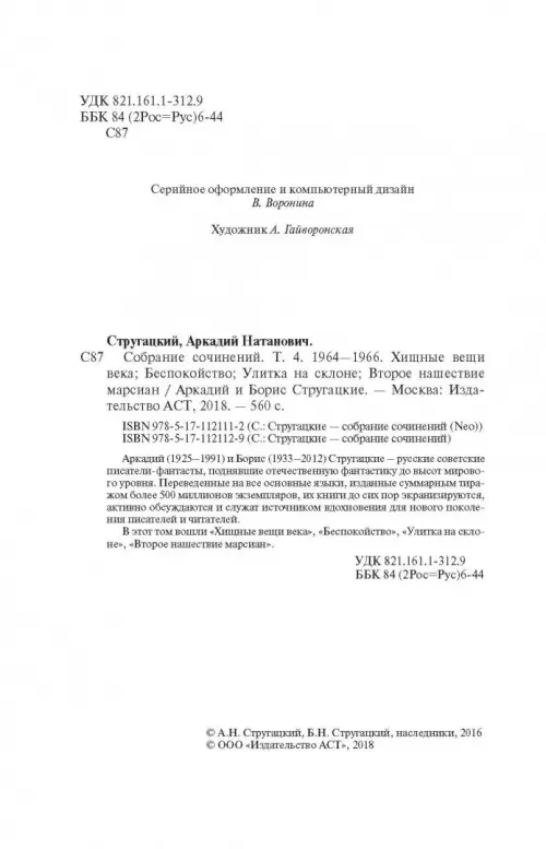 Если вы обнаружили ошибку в описании товара «Собрание сочинений. Том 4. 1964-1966. Хищные вещи века. Беспокойство. Улитка на склоне» (авторы: Стругацкий Аркадий Натанович, Стругацкий Борис Натанович), то выделите её мышкой и нажмите Ctrl+Enter. Спасибо, что помогаете нам стать лучше!