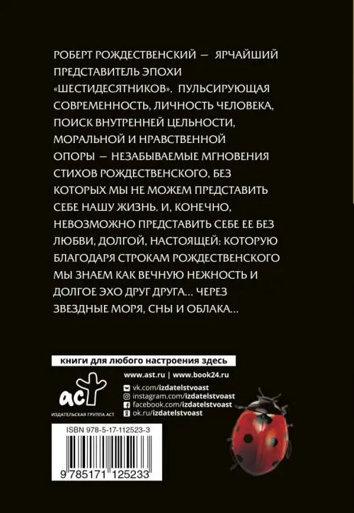 Роберт Рождественский - ярчайший представитель поколения "шестидесятников" наряду с Евгением Евтушенко, Владимиром Высоцким, Андреем Тарковским, Андреем Вознесенским. Нерв его стиха близок нескольким поколениям читателей. Рождественский, создав поэтические портреты целых эпох, говорит с нами о молодости и зрелости, о самореализации человека, о великой войне, мужестве и трусости, любви и верности. О том, что всегда волновало и волнует думающего человека...