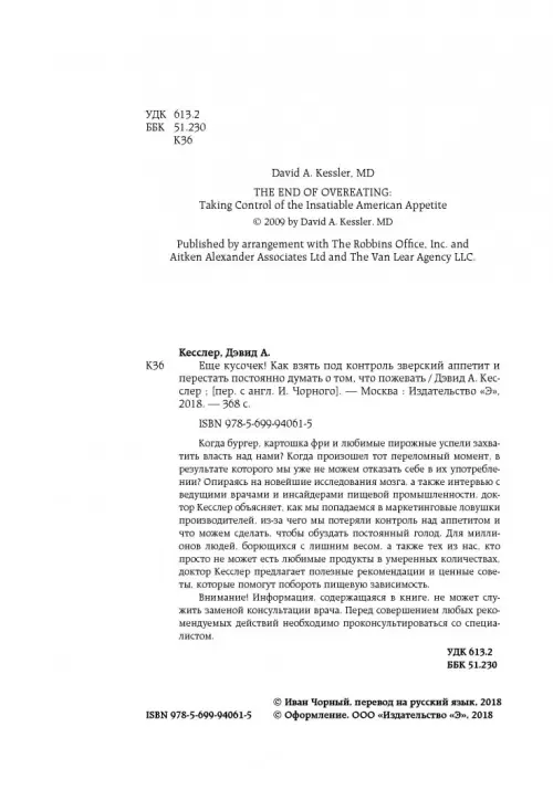 Когда бургер, картошка фри и любимые пирожные успели захватить власть над нами? Когда произошел тот переломный момент, в результате которого мы уже не можем отказать себе в их употреблении? Опираясь на новейшие исследования мозга, а также интервью с ведущими врачами и инсайдерами пищевой промышленности, доктор Кесслер объясняет, как мы попадаемся в маркетинговые ловушки производителей, из-за чего мы потеряли контроль над аппетитом и что можем сделать, чтобы обуздать постоянный голод. Для миллионов людей, борющихся с лишним весом, а также тех из нас, кто просто не может есть любимые продукты в умеренных количествах, доктор Кесслер предлагает полезные рекомендации и ценные советы, которые помогут побороть пищевую зависимость.