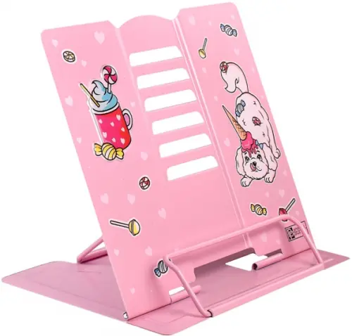 Подставка для книг и учебников. ЩЕНОК СЛАДКОЕЖКА. Размер: 19х20х15.5 см. Материал: окрашенный чёрный металл. Регулировка угла наклона - есть. Количество углов наклона - шесть. Прижим для фиксации страниц - есть. Отделка: УФ-печать, стикер с полноцветной запечаткой. Пол: для девочек. Индивидуальная упаковка: ПЭТ-пакет.