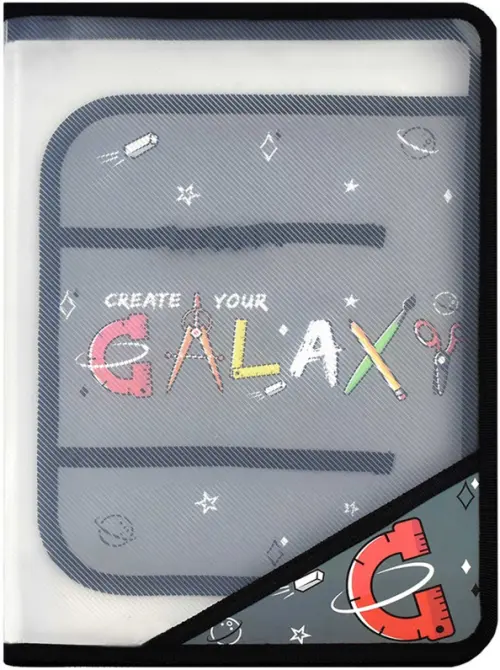 Папка для уроков труда. ГЭЛЭКСИ. Формат А4. Размер: 22.8x32.8 см. Материал: полипропилен. Толщина: 500 мкм. Количество отделений: 1. Тип застёжки: молния. Цвет - серый, чёрный. Отделка: УФ-печать, полноцветный дизайн. Особенности: внутренний разделитель с эластичными держателями для канцелярских принадлежностей.