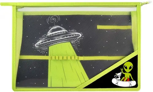 Папка для уроков труда. НЛО. Формат А4. Размер: 33х23 см. Материал: полипропилен. Толщина: 500 мкм. Количество отделений: 1. Тип застёжки: молния. Цвет - чёрный+зелёный. Отделка: УФ-печать, полноцветный дизайн. Особенности: внутренний разделитель с эластичными держателями для канцелярских принадлежностей.