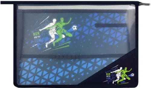 Папка для уроков труда. ФУТБОЛИСТЫ. Формат А4. Размер: 33х23 см. Материал: полипропилен. Толщина: 500 мкм. Количество отделений: 1. Тип застёжки: молния. Цвет - синий. Отделка: УФ-печать, полноцветный дизайн. Особенности: внутренний разделитель с эластичными держателями для канцелярских принадлежностей.